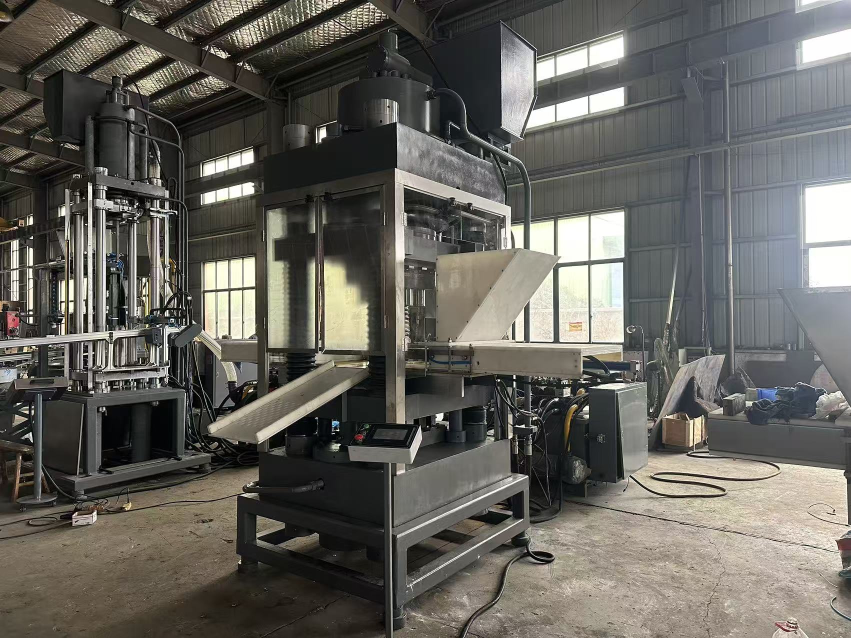 此机为四柱粉末成型机,此压机可实现多腔模具压制,双向压制,保压,大大提高生产效率。电器控制系统采用电脑系统控制,时间可以随加工情况调整,可实现自动和手动两种工作方式。主要有主机及控制结构两大部分组成,通过主管道及电器装置连接起来的。主机包括机身、主油缸和顶出缸。